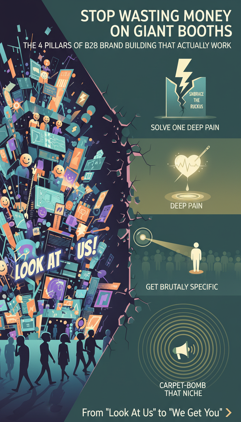 This blog post argues that traditional B2B brand building, often characterized by large, flashy trade show booths and generic awareness campaigns, is an illusion that wastes money. Instead, it proposes a shift towards a more targeted, resonant approach centered on four key pillars that foster genuine connection and drive tangible business results.