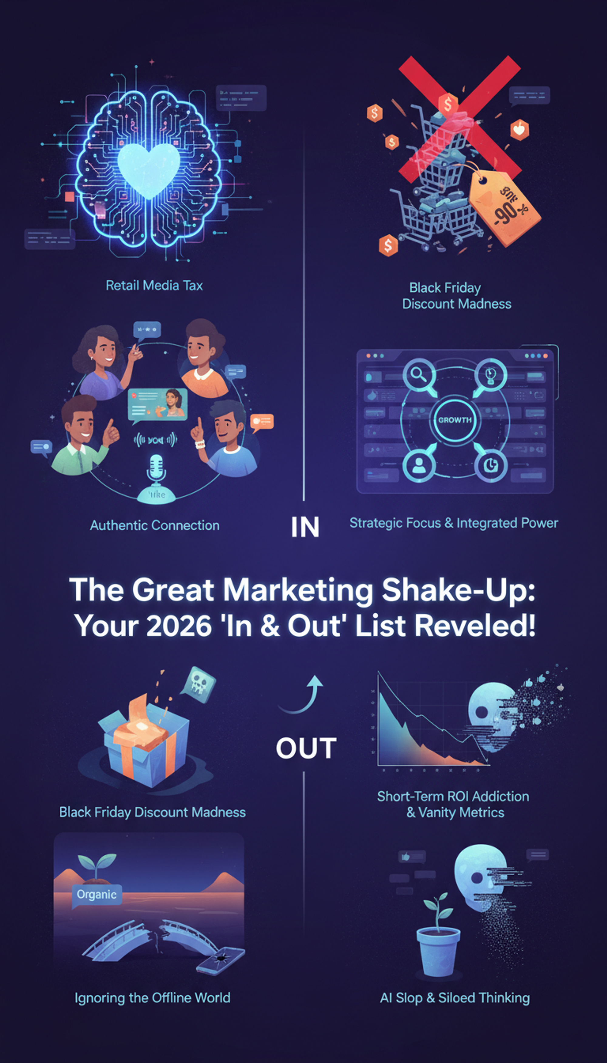 The marketing playbook is being rewritten for 2026. As we move away from "Black Friday madness" and AI-generated "slop," the new winners will be brands that balance sophisticated AI co-pilots with a genuine human heartbeat. This report breaks down the essential "In & Out" list for the coming year, covering everything from Generative Engine Optimization (GEO) to the rise of sonic branding and the decline of short-term ROI addiction.
